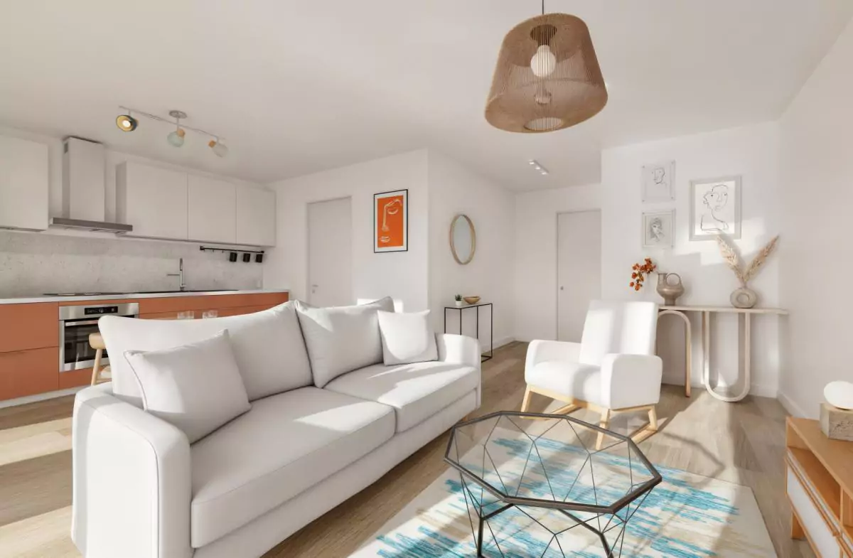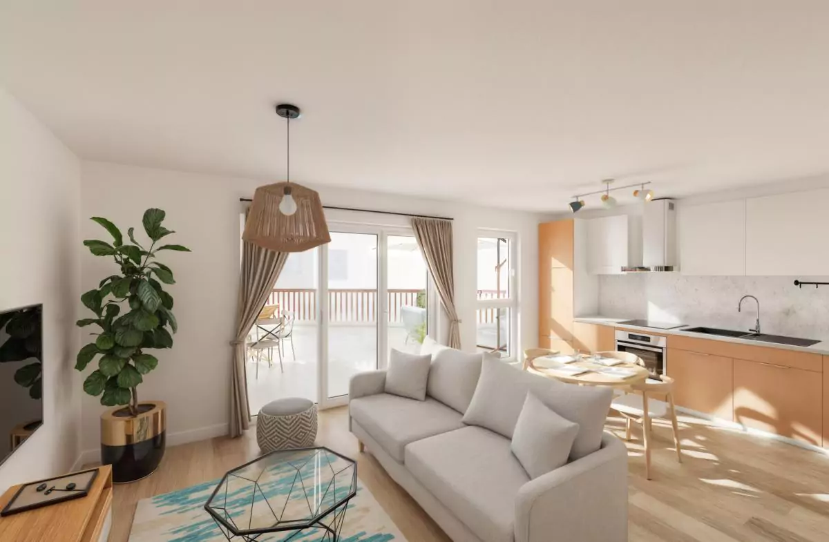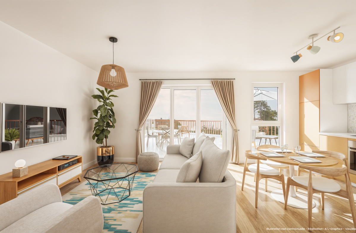 Pour plus de convivialité, de gain de place et de luminosité, la cuisine est ouverte sur le séjour (28.55 m²) qui donne sur une grande terrasse de 47 m².