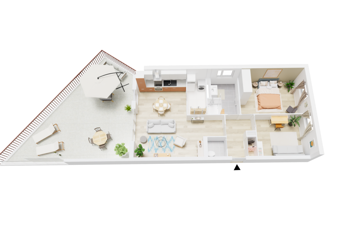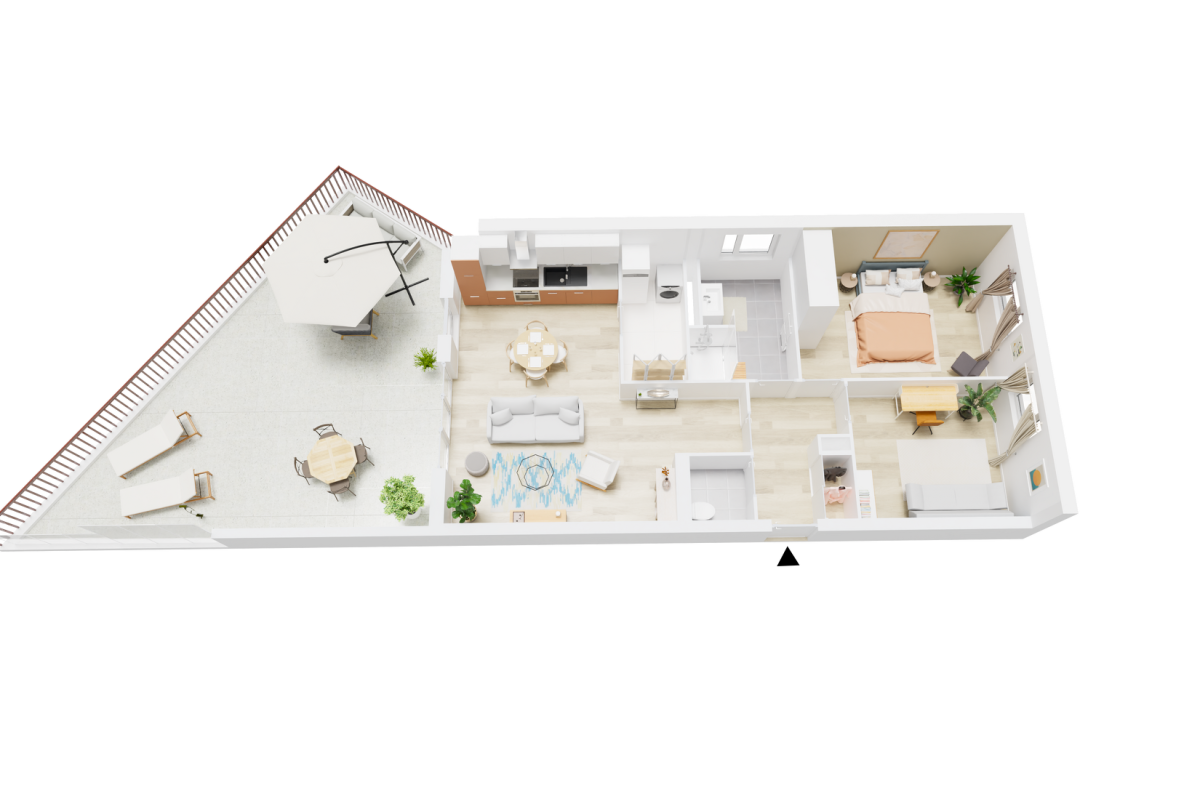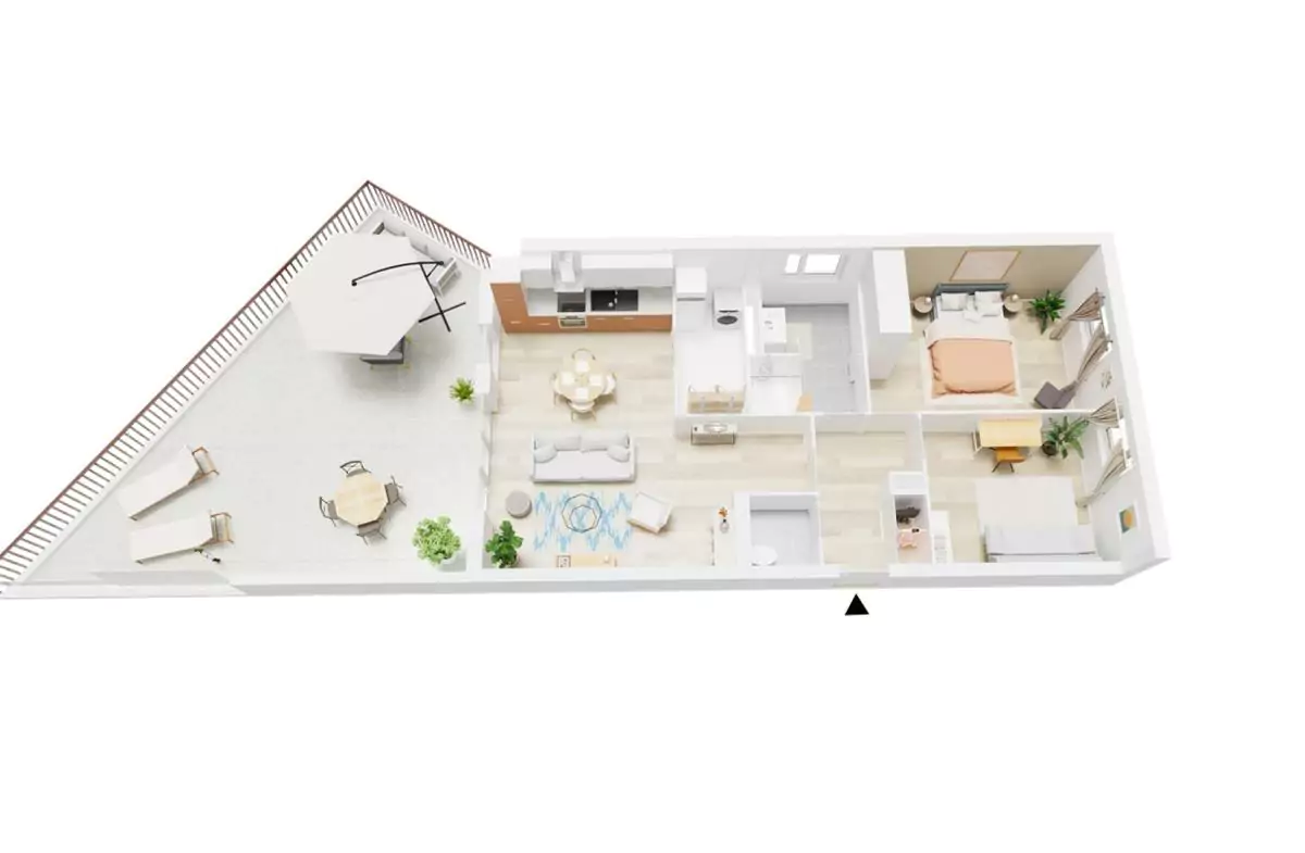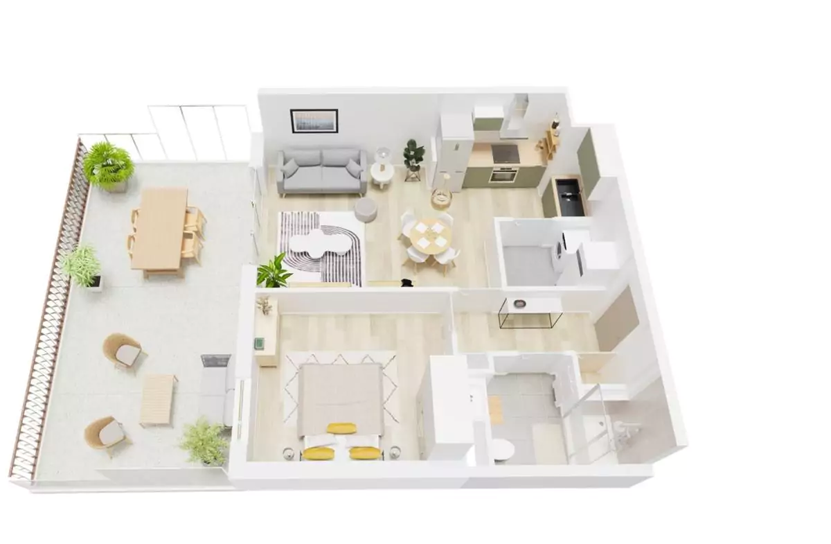 Pour plus de convivialité, de gain de place et de luminosité, la cuisine est ouverte sur le séjour (28.55 m²) qui donne sur une grande terrasse de 47 m².