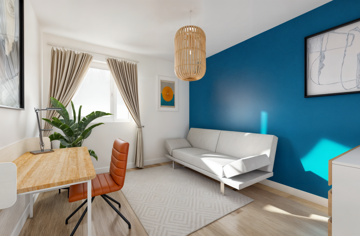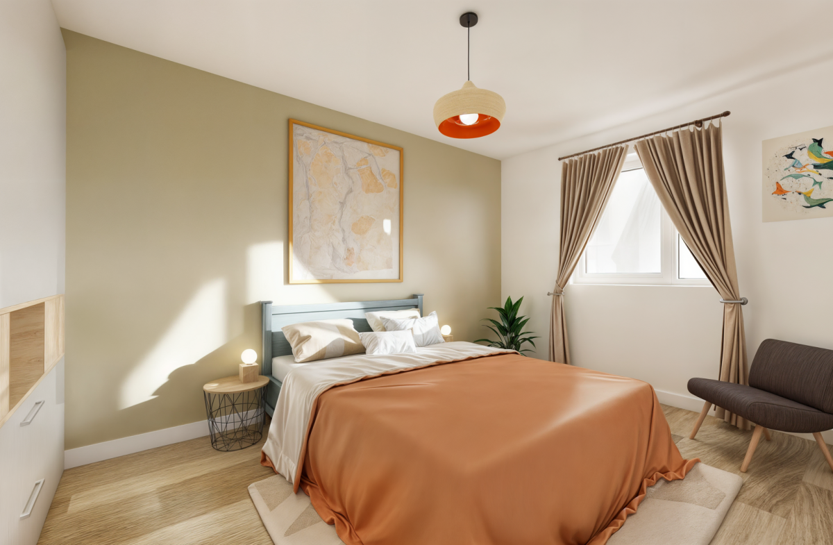 Il dispose de deux chambres spacieuses (12.8 m² et 10.3 m²), d’un cellier, de WC séparés de la salle d’eau, d’un placard dans l’entrée.
